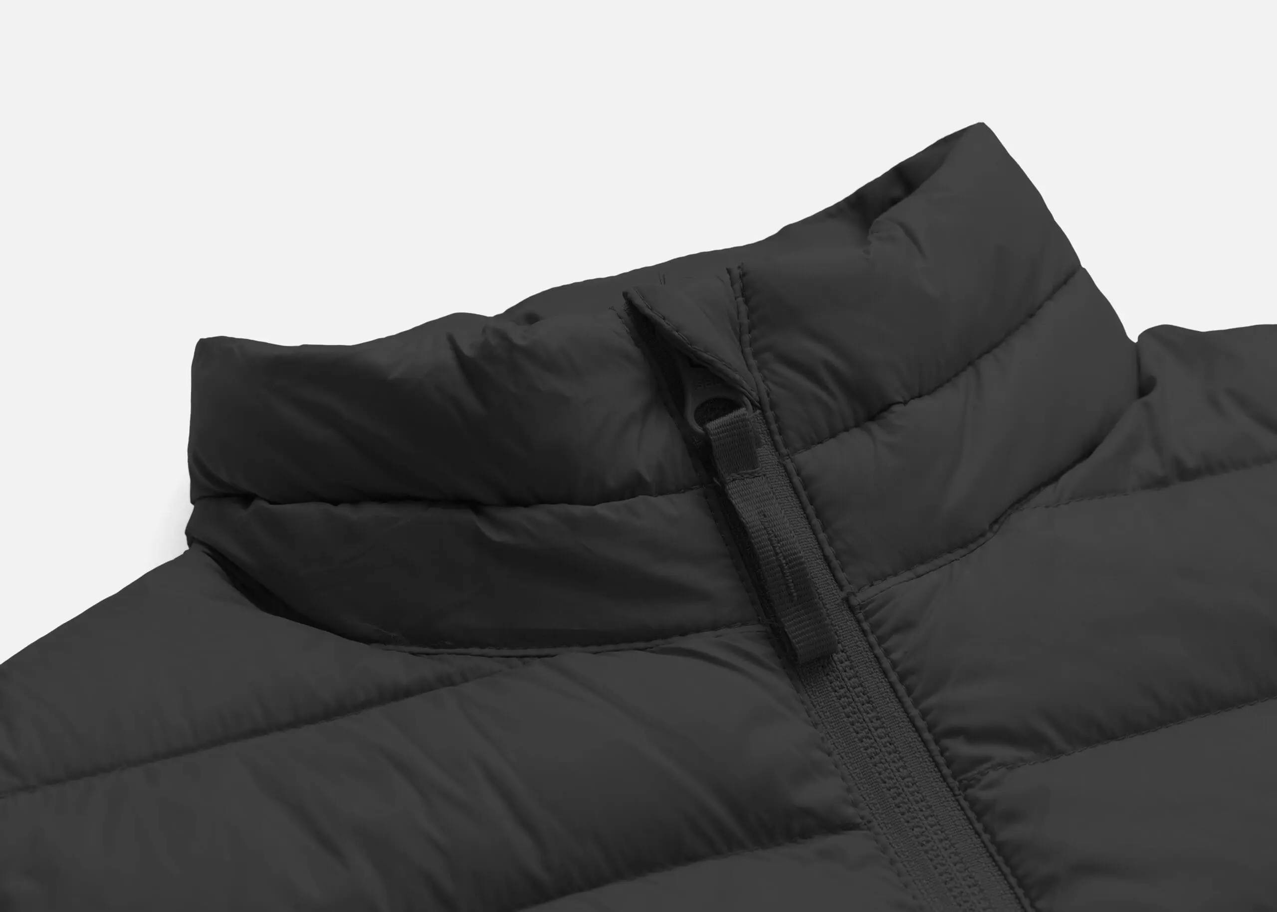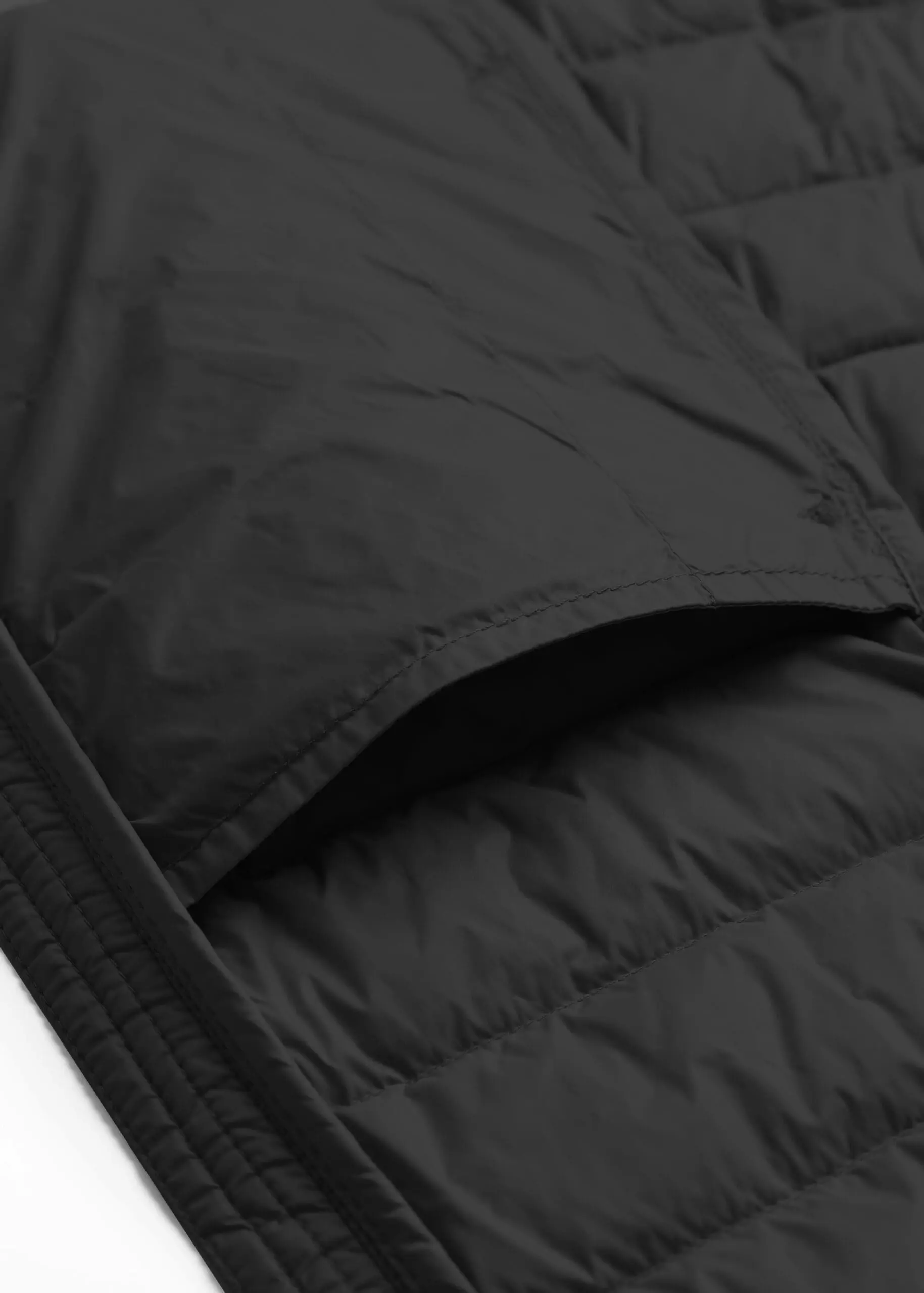 – Nylon 380T; Buitenkant en voering: 100% Polyamide; Vulling: 90% Dons / 10% Veren; 70 g/m².– Sluiting met rits– 2 voorzakken met rits– 2 binnenzakken– Kleine hoge kraag– Nauwsluitende snit– “In bag” vouwsysteem met stoppers– Merkloos maatlabel– Handwas– Slim-Fit (getailleerd)