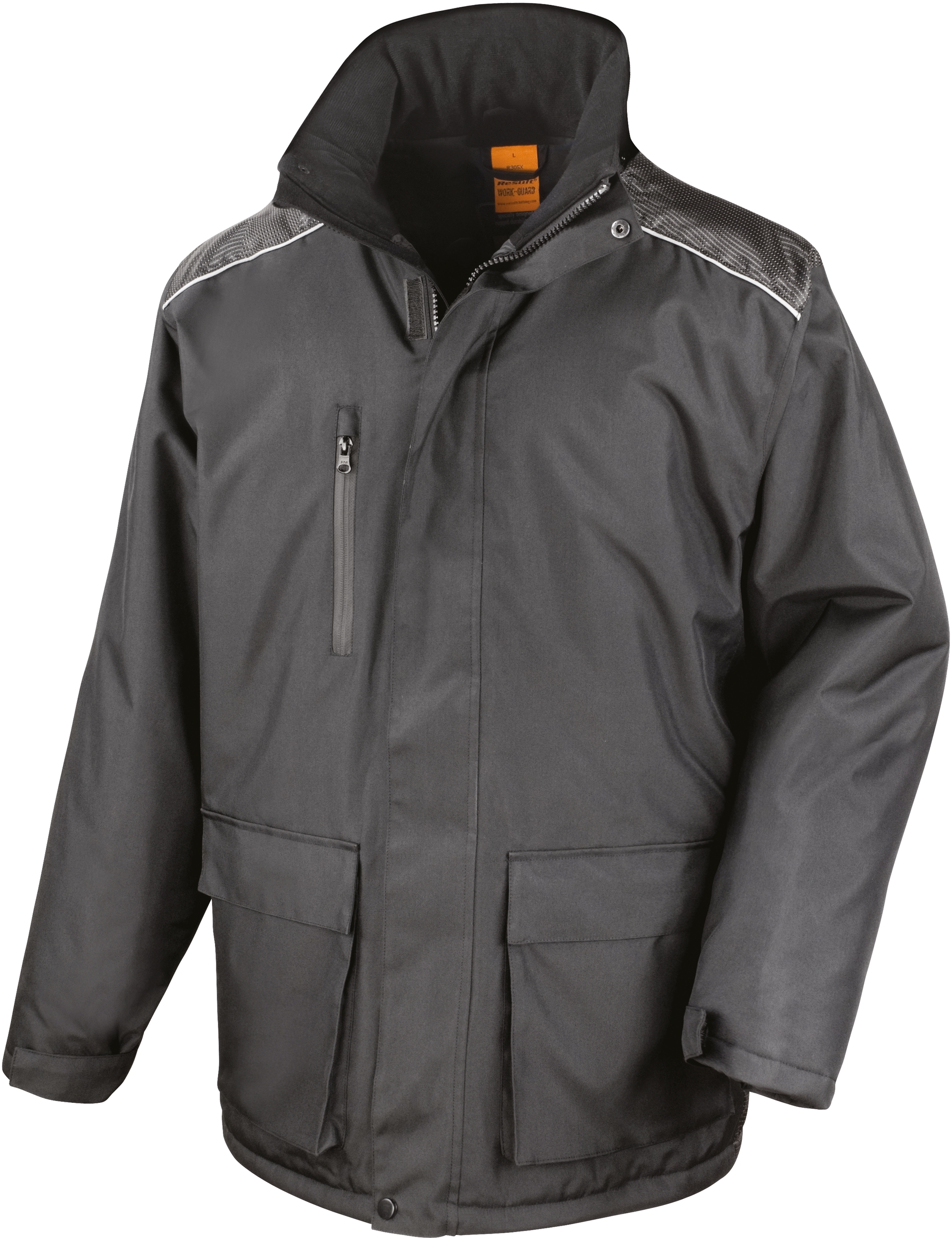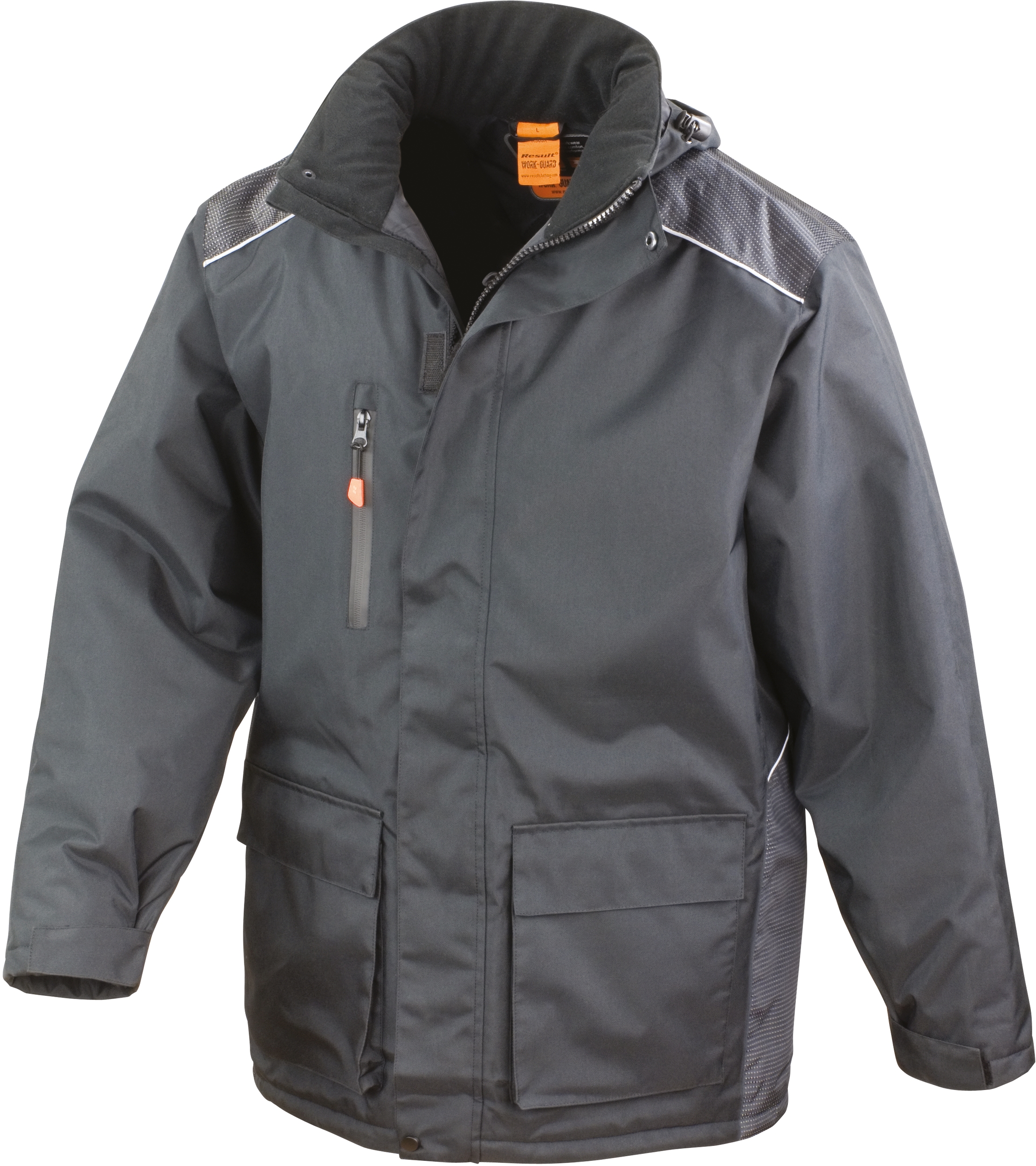 Buitenkant: 300D 100% oxford polyester met PVC coating. Voering: 210T 100% polyester taffeta. Vulling: 100% polysterwatten. Waterdicht tot 2000mm. Windbrekend. Ruitvormige binnenvoering. Ritssluiting in twee richtingen aan de voorkant met stormoverslag met klittenband en drukknopen. Gevoerder gebreide kraag. Verstelbare en afneembare capuchon dmv een rits. Gecontrasteerde inzetstukken in Dobby. Reflecterende biesjes. Meerdere zakken: opgelegde voorzakken met klittenbandsluiting, zijzakken met handwarmers, borstzak aan de binnenkant. Onderkant verstelbaar met aanrijgkoord. Mouwuiteinden gebreid en verstelbaar met klittenbandsluiting. Afneembare ritstrekkers (4 verschillende kleuren meegeleverd).