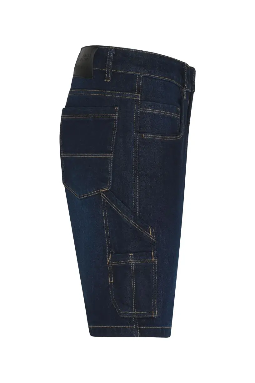 Jeansshort met veel details– Duurzaam denim van biologisch katoen en gerecycled polyester met elasthaan, comfortabel– Tailleband met riemlussen– Scheurvaste drievoudig gestikte naad– 2 zakken met muntvak– 2 achterzakken– Diverse gereedschapszakken, duimstokzak, pennenhouders, gsm-zak– Ritsen: YKK